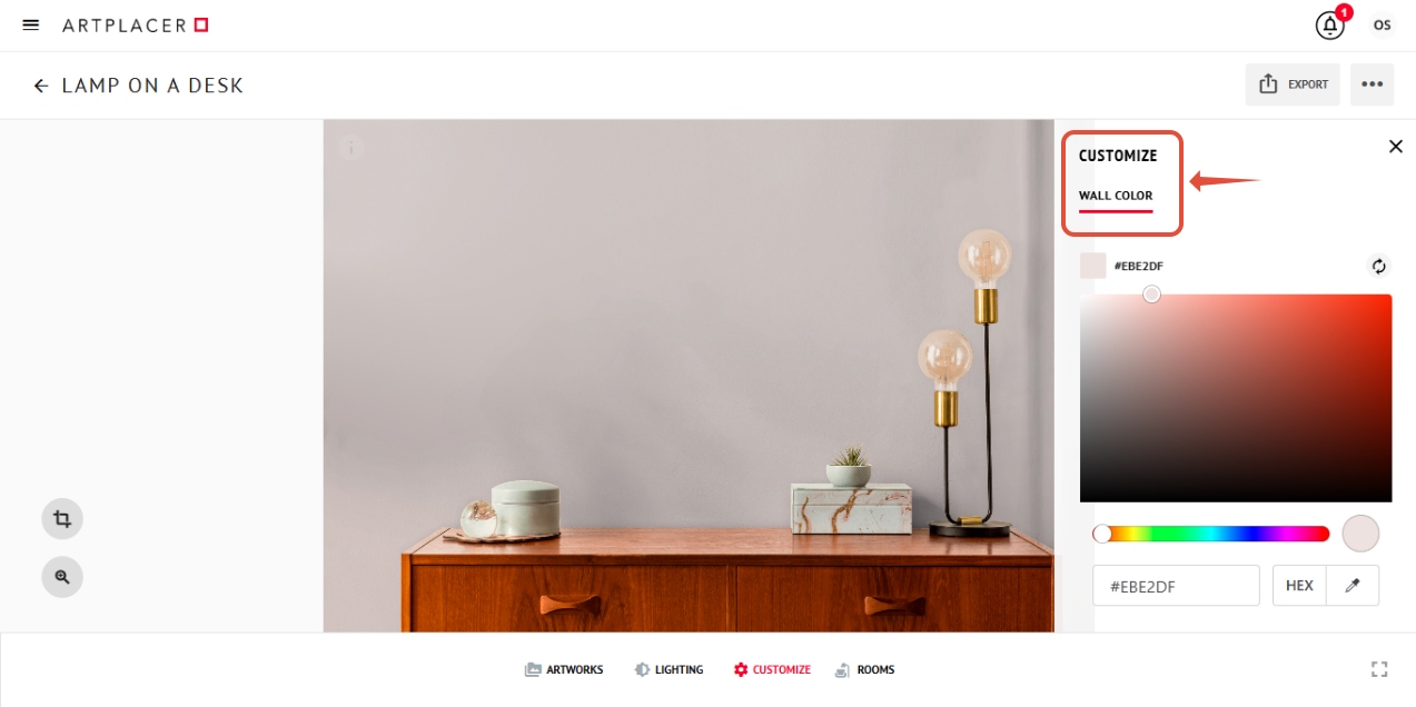Smart Spaces are a special category of Room Mockups that allow you to layer your Artwork behind objects and customize the color of the walls.