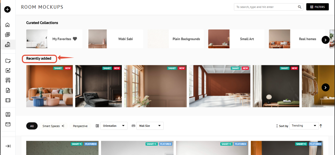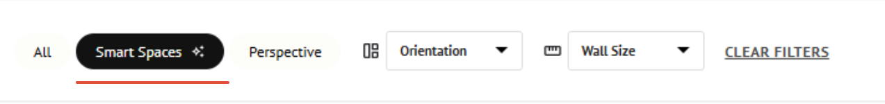 To locate Smart Spaces, access the Room Mockup section and select Smart Spaces from the dropdown in the filter panel.
