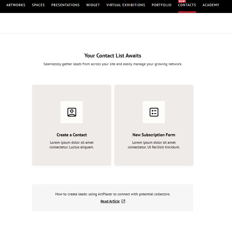 - Automatic Contact Creation – Whenever you receive an inquiry or message through ArtPlacer (Virtual Exhibitions, Online Portfolio, Viewing Rooms, etc.), a new contact is automatically added.