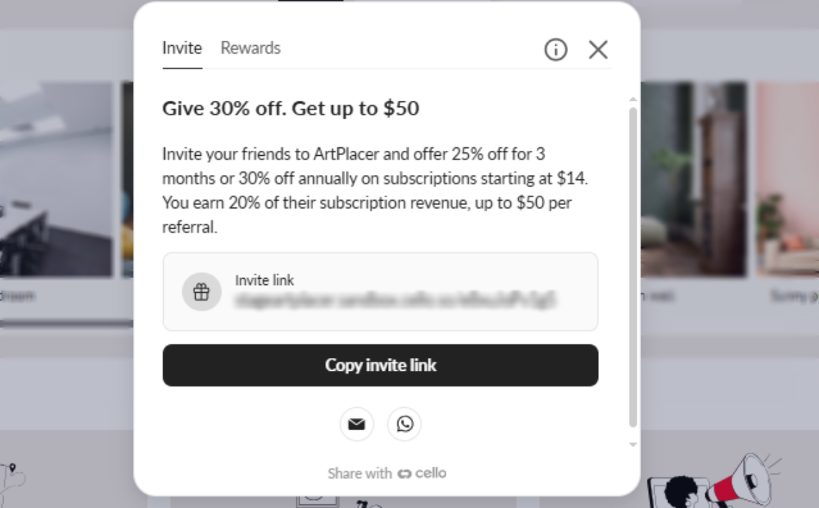 Share ArtPlacer with your friends and network, and earn rewards when they become customers.