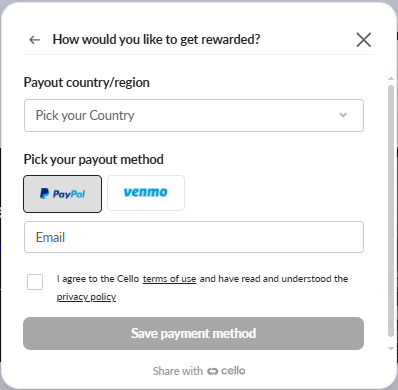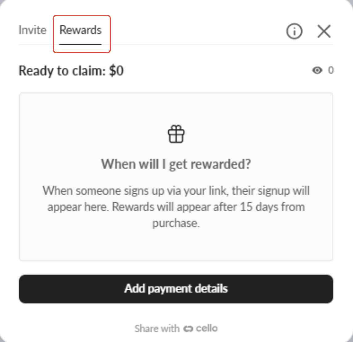 Once you earn your first reward, you can select your preferred payment method directly in the referral widget. After your details are processed, your first reward will be issued and all future rewards will be transferred automatically.